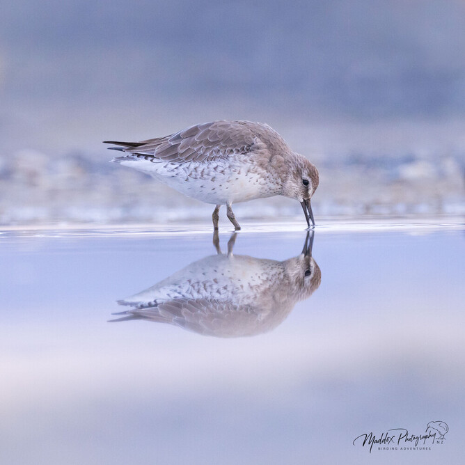 Soft, even lighting, typically found during golden hour is favourable. Low-angle light at sunrise or sunset not only enhances the bird’s form and plumage but also adds warmth and texture to the water, like in this image below. Harsh midday light creates distracting highlights and kills the reflection. Overcast days can also work well, offering even tones and subtle contrasts. This photo was taken on a recent trip to Napier in the early soft morning light.